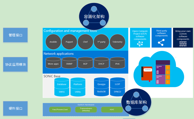 做公有云的微软自然的想到通过虚拟化重构NOS,将容器技术应用到了NOS。容器技术可以简单理解为:对Linux操作系统来看是容器是一个进程,容器看自己内部是一个轻量级虚拟机。Sonic将各种进程,比如BGP运行在容器中,原生的解决了JunOS提出的模块化问题,更重要是配合数据库架构,由对单进程的升级,变成了对容器的升级,聪明的使用成熟通用的技术解决传统问题。